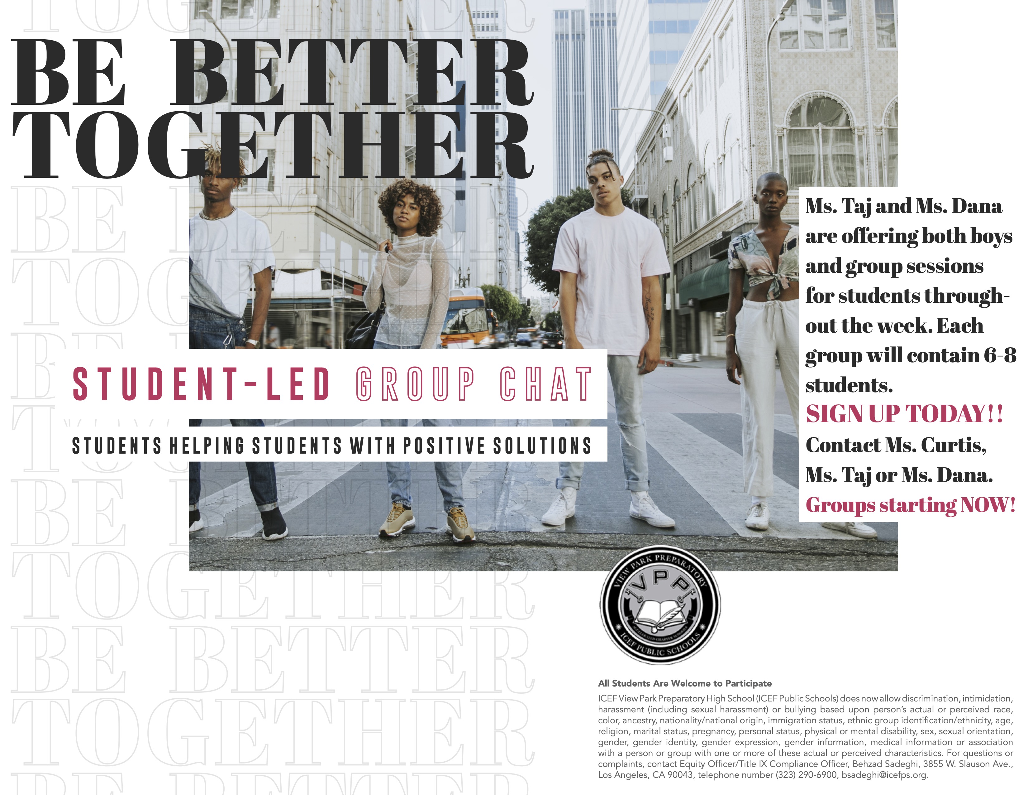 A flyer designed to appeal to students of color at ICEF View Park Preparatory High School. The flyer was to promote a student-led group chat where students could share their shared life experiences in an effort to build a supportive community around the challenges of learning and living.