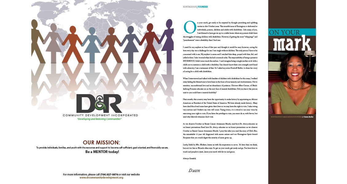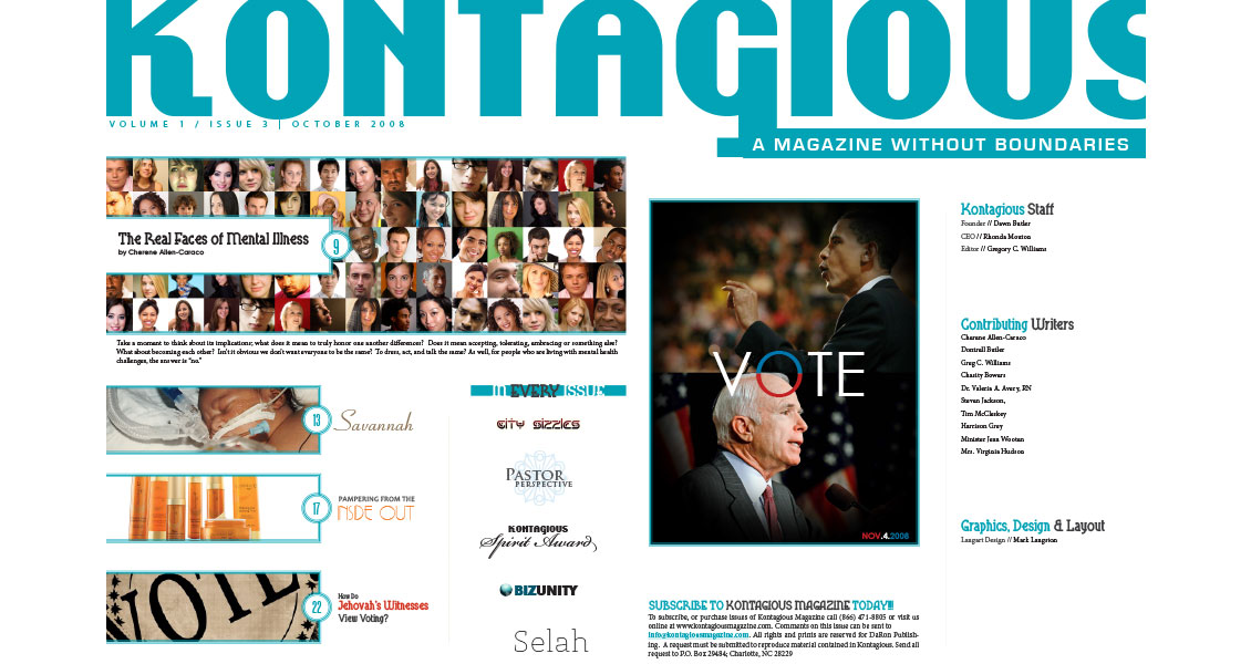 I was first connected to Dawn and Rhonda through my father who, after seeing their first issue of their brand-new start-up magazine Kontagious, suggested they reach out to his son (that'd be me) to see if I could assist in bringing a refined voice to future publications. The first issue lacked a certain level of polish the ladies' wanted to convey so together we created something that reflected their personal sense of style and professionalism.
